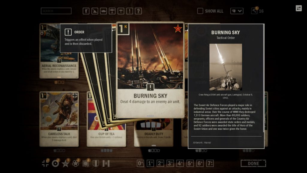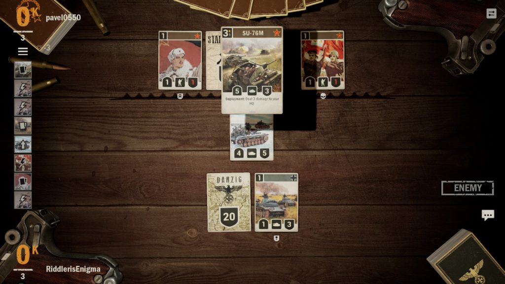 Her kart oyununda olduğu üzere KARDS’da da amacımız rakibin can değerini sıfıra indirmek. Oyunda can değerimizi koruyan merkezimiz ise Headquarter(HQ) ismine sahip. Oyundaki sınıf sistemi ise II. Dünya Savaşı’na katılan ülkelerden meydana geliyor. Dergide yazdığım erken erişim ilk bakışı esnasında oyunda 5 adet ülke bulunuyordu. Bunlar Almanya, Büyük Britanya, Sovyetler, ABD ve Japonya’dan oluşuyordu. Daha sonra gelen güncellemeler ile oyuna Fransa ve İtalya da eklendi. Deste oluştururken iki farklı ülkenin kartlarından yararlanabiliyorsunuz. Ancak şöyle bir durum var ki ilk başta ana ülkeyi, sonra ona müttefik olacak ülkeyi seçiyorsunuz. Seçtiğiniz ana ülke başta saydığım beş ülkeden biri olmak zorunda. Fransa ve İtalya sadece müttefik olarak seçilebiliyor. Destenize 40 adet kart alabiliyorsunuz. KARDS’ın oynanışta ön plana çıktığı nokta, cephe sisteminden ileri geliyor. Oyun masasında savunma ve saldırı olmak üzere her oyuncunun kullanabileceği iki cephe bulunuyor. Kartınızı savunma cephesine iniyorsunuz ve saldırı cephesini elde tutmaya çabalıyorsunuz. Hava birliklerinden oluşan kartlar ile birkaç istisna kart dışında, rakibin HQ’ına sadece saldırı cephesinden hasar verebiliyorsunuz. Bu nedenle saldırı cephesinin rakip tarafından ele geçirilmesi rakibin sizin HQ’ınıza saldırabilmesi anlamını da taşıyor. Bu tür durumlarda bir an önce saldırı cephesindeki rakip kartları temizleyerek kendi kartlarınızdan oluşan birlikleri saldırı cephesine sürmelisiniz. Tabi tüm bunları yapabilmeniz için oyunda zırhlı birlikler, piyadeler, hava birlikleri, tank birlikleri gibi birçok farklı kart tipi yer alıyor. Bunun yanında KARDS’da order olarak geçen ve diğer oyunlarda büyü kartı olarak nitelendirebileceğimiz kartlar da yer alıyor. Ayrıca bazı kartların her kart oyununda olduğu gibi bazı özel yetenekleri bulunuyor. Mesela guard kartlar, yok edilmeden diğer birimlere saldırı yapılamıyor. Blitz kartlar, aynı turda 2 farklı hareket gerçekleştirebiliyor ve daha agresif oyuncuların tercihi durumunda. Bu gibi farklı özellikler oyuna stratejik derinlik katıyor. Ayrıca kartların her birinin tarihsel gerçekliklerden esinlenmiş olması, koleksiyona girerek her bir kart hakkında tarihsel bir bilgi edinmek hoş.