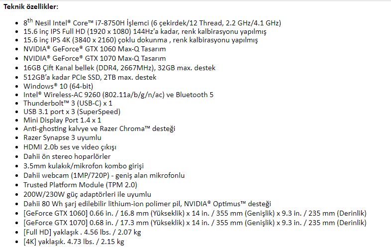 Çerçevesiz denilebilecek yeni Razer Blade içerisinde 8th nesil Intel® Core™ i7-8750H işlemci bulunuyor. Ona NVIDIA® GeForce® GTX 10 serisi ekran kartı eşlik ederken 6 çekirdekli yeni işlemci Turbo Boost hız arttırımı ile 4.1 GHz’lik inanılmaz saat hızına kadar çıkabiliyor. Kesintisiz, hızlı ekran yenileme oranı ile kullanıcılara GeForce GTX 1060 veya GeForce GTX 1070 seçeneklerini sunan Razer Blade oyunlarda en üst performansı sunmak için Max-Q tasarım özelliğine de yer veriyor.